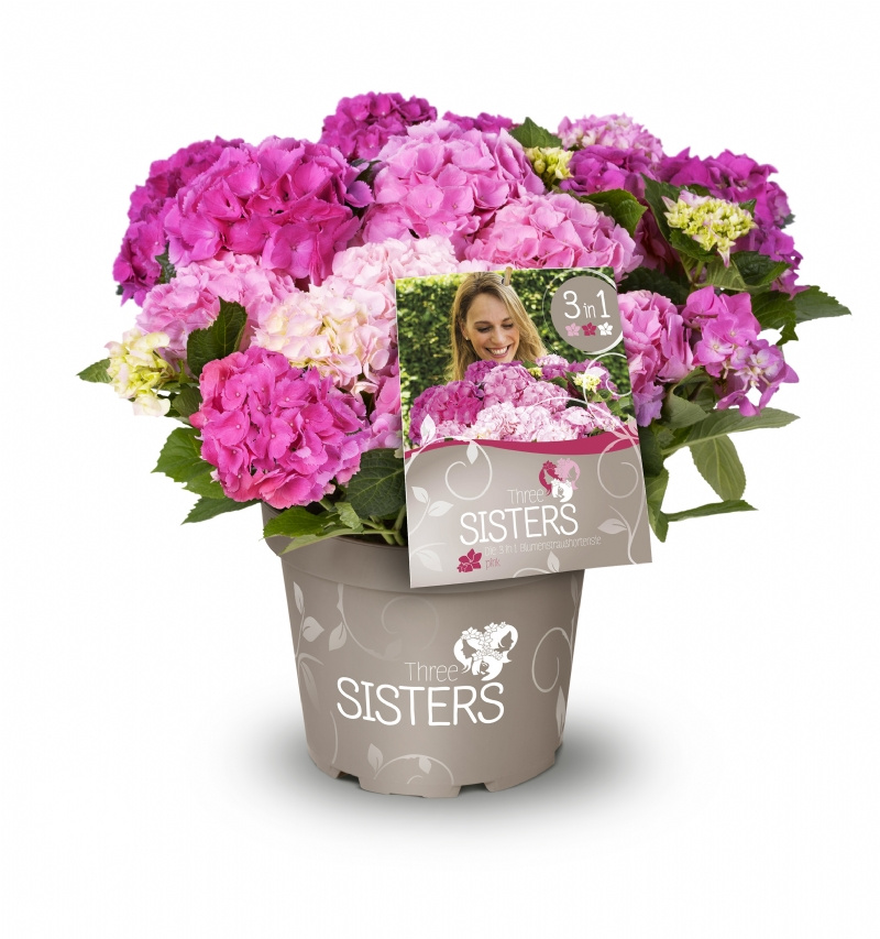 Гортензия крупнолистная ремонтантная Три сестры оттенки розового