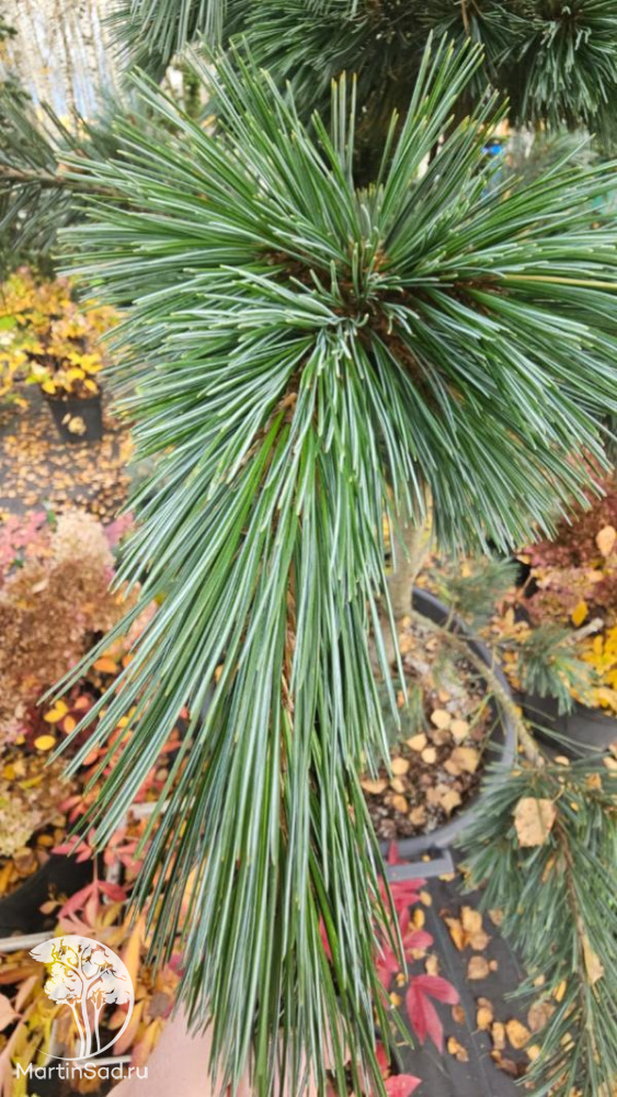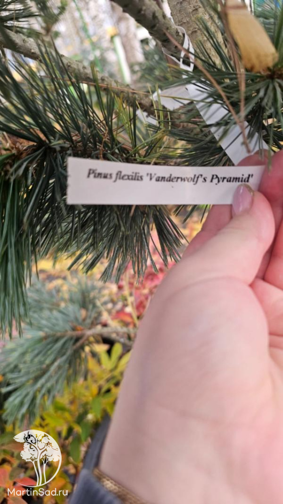Сосна гибкая Вандервольф'с Пирамид - это сосна пирамидальной формы. Выделяется мягкой длинной хвоей сине-зеленого цвета. Ветви чрезвычайно гибкие. Хвоя длинная, мягкая, искривлённая, с сине-зелёным оттенком, в пучках по 5 хвоинок. В молодом возрасте крона очень плотная. Для поддержания желаемой плотности необходимо каждую весну укорачивать молодой прирост. Годовой прирост 30-45 см, к 10-ти годам высота 3-4 м и ширина 1,5 м. Конечная высота 6-7 м, ширина 3-4 м. Место солнечное. Почва дренированная. Отлично подходит в качестве солитера, и в сочетании с другими растениями в композициях как на небольших участках, так и в паркостроении.