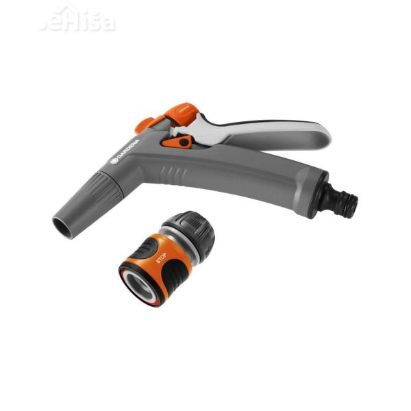 Комплект Gardena: пистолет-наконечник для полива Classic + стандартный коннектор 1/2" 18341-32.000.00 используется для очистки поверхностей и бережного полива хрупких растений.