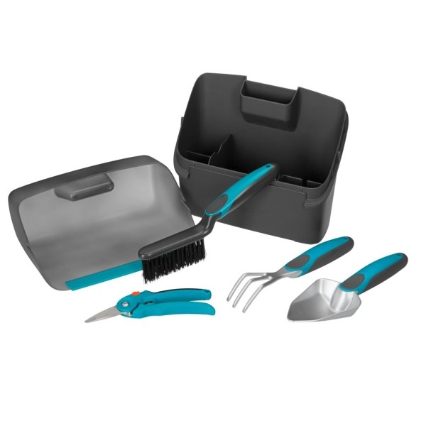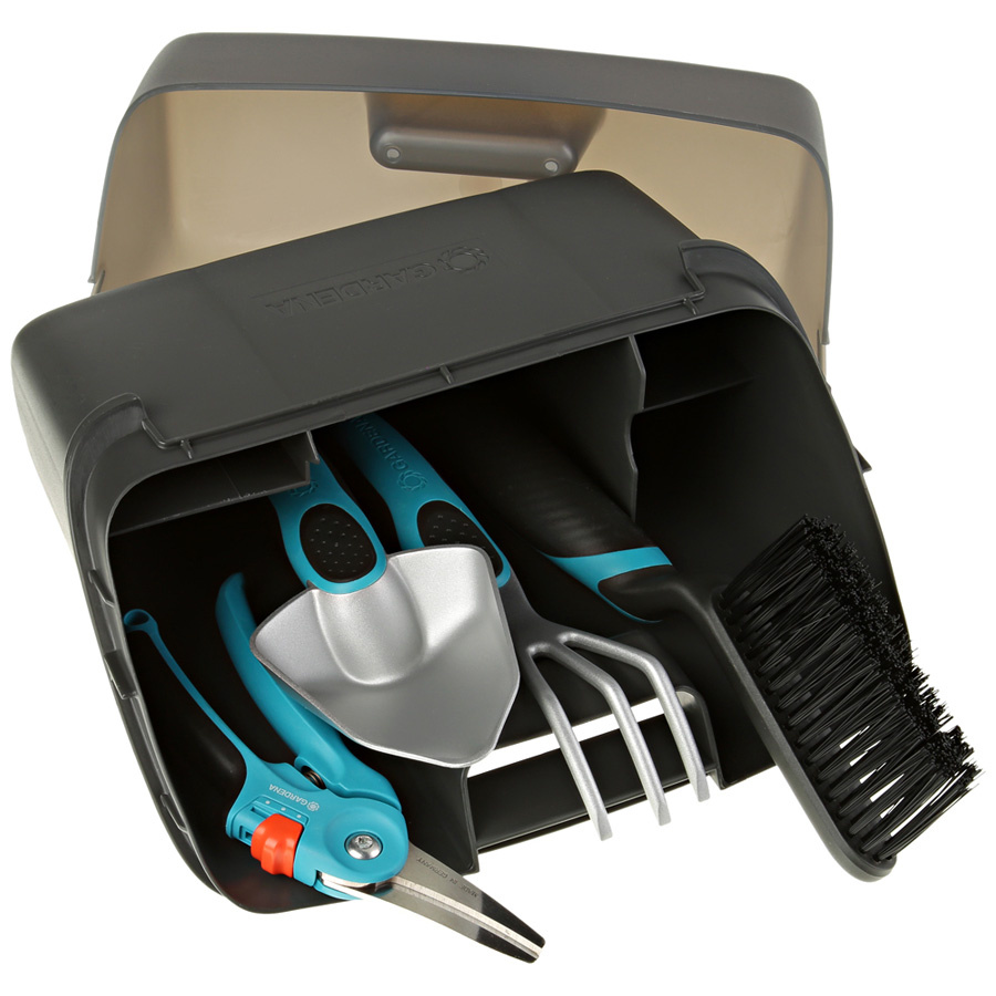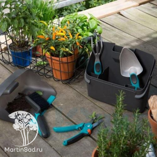Комплект садовых инструментов Gardena для балкона "Домашнее садоводство" (секатор, лопатка цветочная, мотыжка, щетка и совок, ящик для хранения)