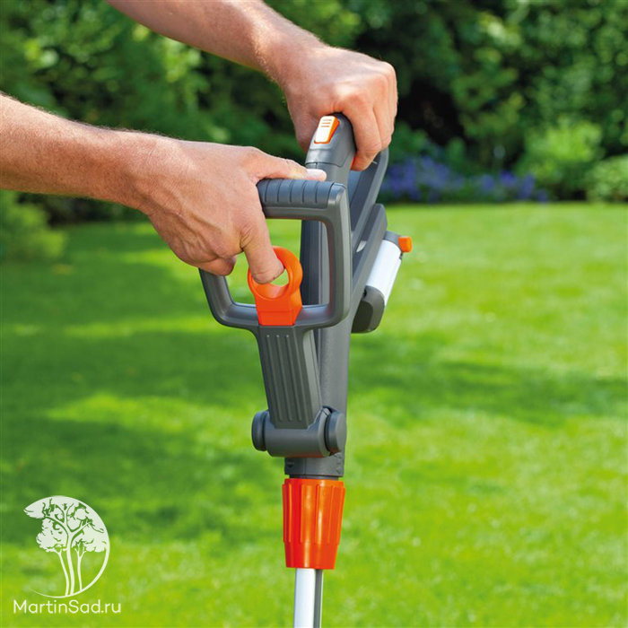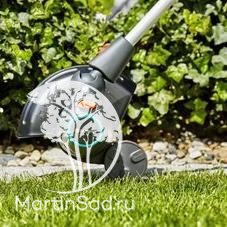 Страсть, заряженная GARDENA. Подравнивание газона без кабеля: это возможно благодаря готовому к использованию комплекту аккумуляторного триммера ComfortCut Li-18/23 с множеством полезных функций для поддержания газона в опрятном виде. Триммер ComfortCut Li-18/23 очень легкий, что делает работу максимально приятной. Вы можете работать с беспроводным триммером в течение длительного времени, не уставая. Аккумулятор также отличается высокой долговечностью; он, как и зарядное устройство, входит в комплект поставки. Отрегулируйте рукоятку и телескопический вал в соответствии с вашими потребностями, чтобы сохранять вертикальное и расслабленное положение во время работы. Особенно полезной является наклоняемая головка, с помощью которой можно добраться до труднодоступных мест, например под стол. Не забудьте о функции обрезки кромок! Она позволяет использовать головку вертикально, повернув переключатель, чтобы без труда подровнять края газона. Благодаря эффективному режущему механизму RotorCut срез всегда получается ровным, так как прочная пластмасса работает точно и чисто. Рядом с местом подравнивания есть растения? Съемный щиток для растений будет полезен.