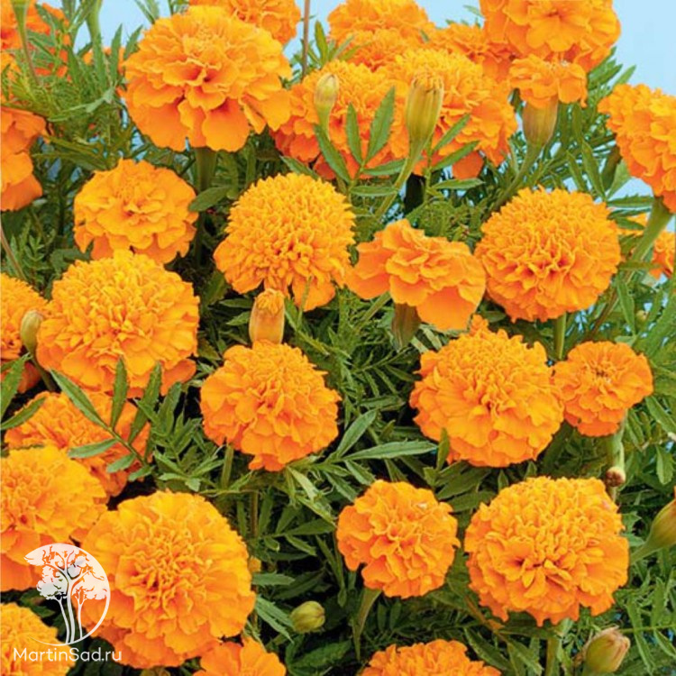 ОписаниеНарядная серия невысоких бархатцев для оформления бордюров, рабаток, вазонов и балконных ящиков. Образует ветвистый кустик высотой 20 см. Соцветия диаметром 4-5 см, оранжевого цвета. Цветет с июня до заморозков. Бархатцы светолюбивы и теплолюбивы, заморозков не переносят, к почвам нетребовательны, но предпочитают плодородные легкие почвы. Посев на рассаду проводят во второй половине марте-начале апреля. Всходы появляются через 4-8 дней после посева, сеянцы пикируют в фазе 2-го настоящего листа. Рассаду высаживают в начале июня с расстоянием между растениями 30-35 см. Посев в открытый грунт проводят в мае на глубину 1,5-2 см.