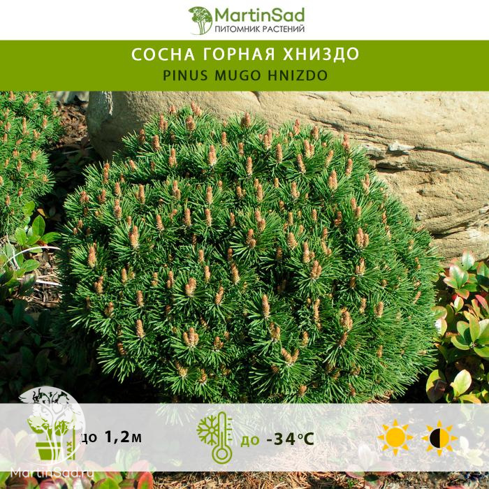 Сосна горная 'Hnizdo' — это карликовый хвойный кустарник с очень плотной, симметричной подушковидной кроной, которая со временем приобретает форму компактного гнезда. Хвоя короткая, густая, насыщенного изумрудно-зеленого цвета, сохраняющая яркость в течение всего года. Растение растет крайне медленно, прибавляя всего по несколько сантиметров в год, что позволяет ему десятилетиями сохранять аккуратный вид без вмешательства садовода. Сорт отличается исключительной выносливостью, морозостойкостью и способностью процветать на бедных каменистых почвах, являясь идеальным акцентом для рокариев и малых садов. Для сорта Pinus mugo 'Hnizdo' максимальная высота взрослого растения спустя 10–20 лет составляет всего около 1–1,2 метра при аналогичной ширине. Сорт обладает исключительной морозостойкостью, относясь к 3-й или 4-й зоне (выдерживает понижение температуры до –34...–40°C), что позволяет ему успешно зимовать под снегом в большинстве регионов без какого-либо дополнительного укрытия.