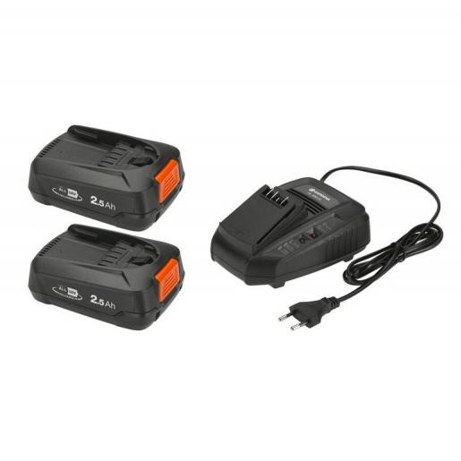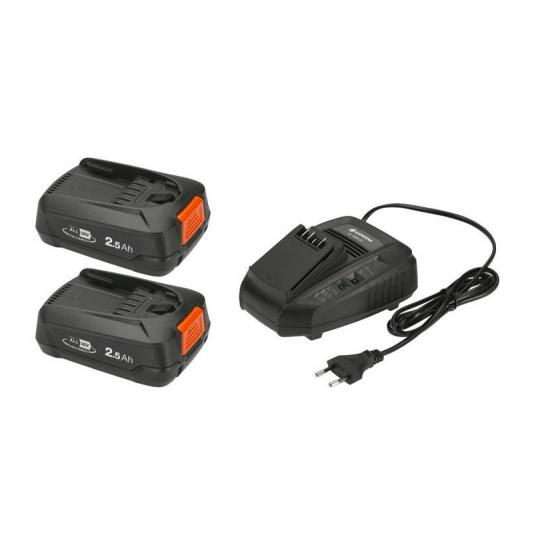 Этот комплект состоит из быстрого зарядного устройства GARDENA AL 1830 CV и двумя аккумуляторами емкостью 2,5 Ач POWER FOR ALL.