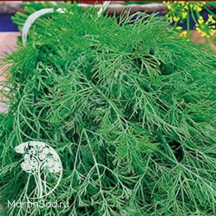 Отличный новый сорт кустового укропа для получения большого количества зелени. Среднепоздний, достигает товарных размеров на 42-45 день от всходов. Растения сильно облиственные, с короткими междоузлиями и замедленным стеблеванием. До начала стеблевания в розетке формируется 18-20 крупных листьев. Рекомендуется многоразовая уборка. В процессе роста каждую неделю обламывают 2-3 листа с растения. Благодаря этому сроки уборки продлеваются до 20-25 дней. Большая продолжительность уборки дает возможность получать более качественную зелень, так как с увеличением возраста растений возрастает их ароматичность. Урожайность зеленой массы 3-4 кг/м 2 .