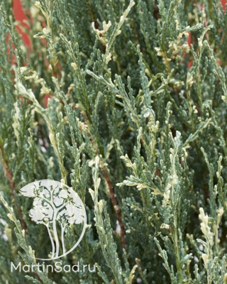 ОписаниеХвоя не колючая, густая, чешуйчатая, серебристо-голубая, с характерными светло-кремовыми пятнами, равномерно расположенными на побегах. Новые приросты побегов - сливочно-белые. Кремовые побеги контрастируют с голубовато-синей хвоей. В зимний период имеет более насыщенный цвет. Побеги расположены плотно, прижаты к стволу. Растут вертикально вверх. Нижние ветви растут почти от самого основания ствола и очень долгое время сохраняются.