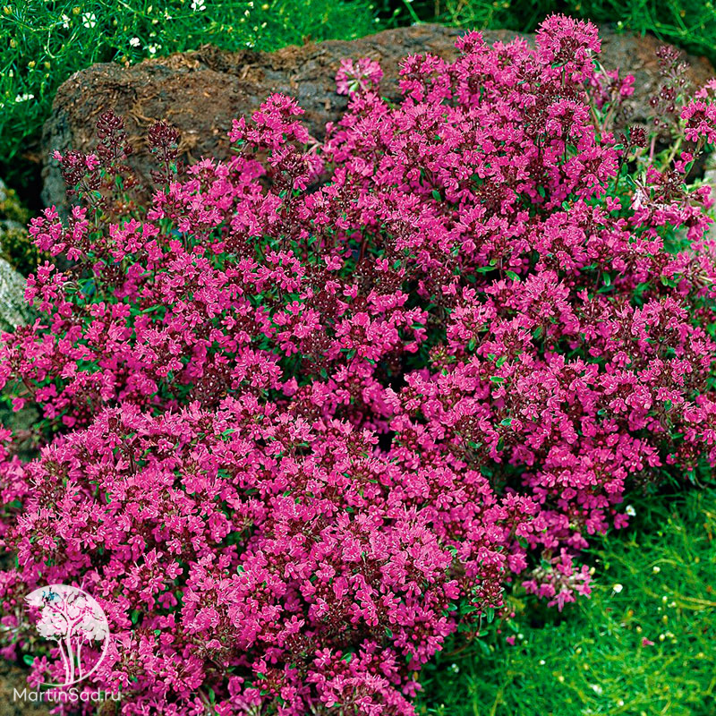 Тимьян ранний Ред Карпет - сорт с маленькими зелеными листьями и ярко-малиновыми цветками.