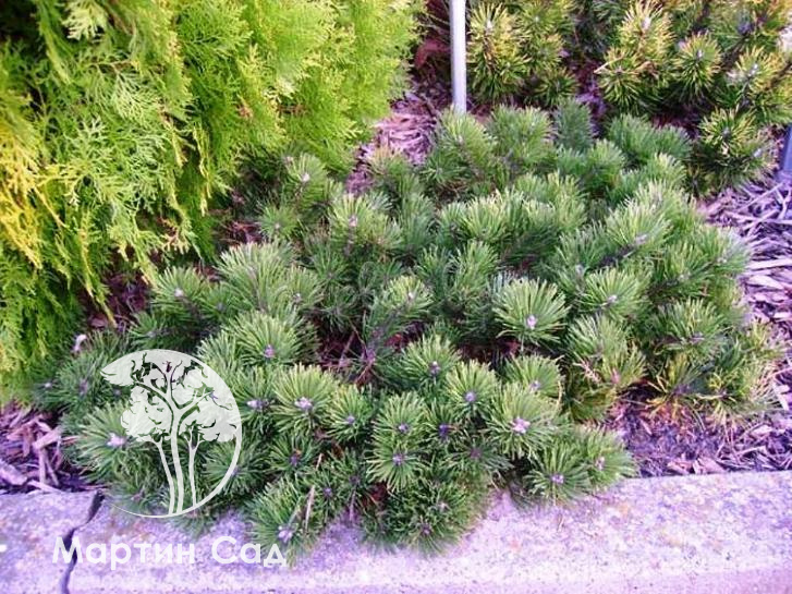 На 1 м в ширины только 0,15 - 0,2 м высоты. Темпы роста медленно. После 10 лет, достигает 0,5-0,7 м в диаметре. Иглы темно-зеленые, в пучке по 2штуки, прямые, радиально расположенные, образуют розетки- помпоны на концах побегов.