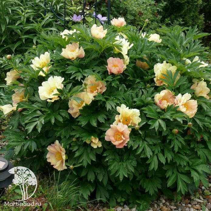 Данные гибриды считаются самыми элитными среди всех садовых пионов. Ведь они отличаются и выносливостью, и устойчивостью к различным заболеваниям. Эти пионы представляют собой довольно мощные и большие кусты, которые отличаются крепкими побегами. Корни у них раскидистые и находятся практически на поверхности. Со временем они деревенеют и они сильно разрастаются, поэтому пересадить их будет не так просто. Корневая система может доходить до 85 сантиметров. Высота куста иногда достигает до 85 сантиметров. Но несмотря на это, побеги только наклоняются под весом пионов, но не ложатся на землю. Листья схожи с листьями древовидных пионов – такие же резные. К тому же они больше напоминают зеленую подушку, которая может сохраняться до самых морозов. Их цвет к осени меняется только в нескольких сортах.