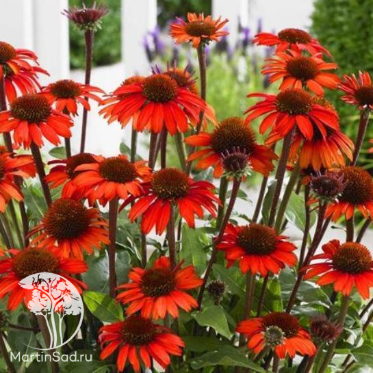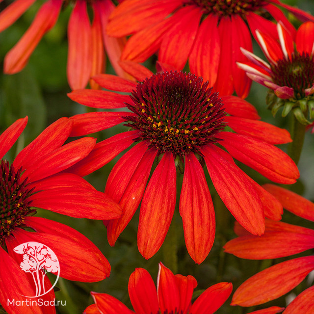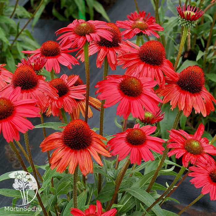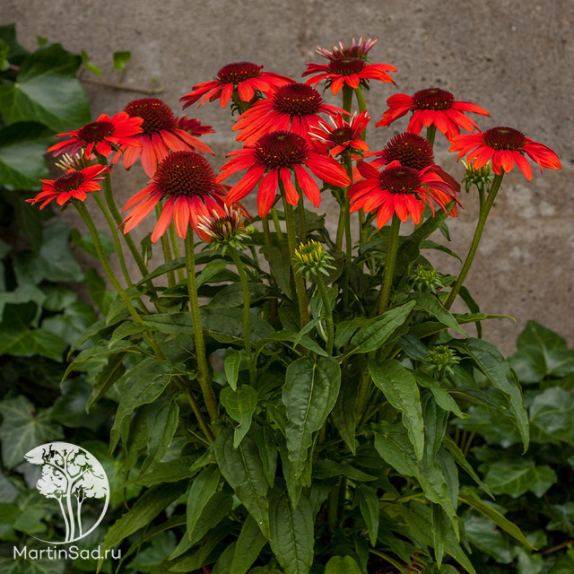Высота 50-100 см, ширина 30-60 см; соцветие-корзинка, размер 8-12 см, лепестки ярко-красные; ланцетные листья зеленые; время цветения эхинацеи: июль-сентябрь; лучше солнце, подойдет полутень; морозоустойчивость до -30 °С, в 3-4 зонах укрывают опавшими листьями; высокая болезнеустойчивость.