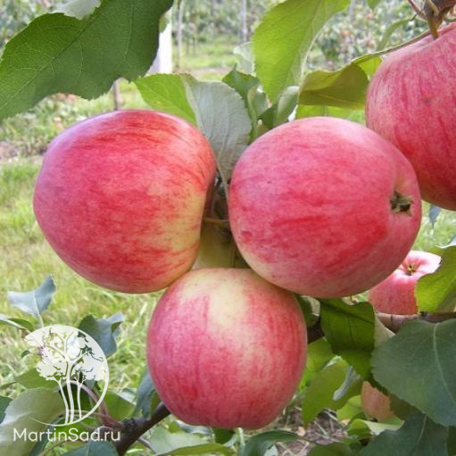ОписаниеМельба - дерево среднего роста, как правило, имеет высоту 3—4 метра. Быстро растёт в молодом возрасте, после 8—10 лет рост замедляется. Крона широкоовальная, приподнятая, загущённая. Скелетные ветви массивные, отходящие под углом 60—80°. Тип плодоношения — смешанный, бо́льшая часть плодов завязывается на кольчатках. Срок активного плодоношения Мельбы на карликовых подвоях — 10—15 лет, на полукарликовых — 20 лет. Высокорослые долгожители достигают возраста 40—55 лет. Дерево Мельбы имеет высоту 3—4 метра Плоды неоднородные по размеру. Средняя масса — 120—140 грамм, но достигает и 300 грамм. Форма правильная, округлоконическая, слегка приплюснутая. Кожица плотная, но нежная, слегка маслянистая, с зеленовато-жёлтой основной окраской. Покровная окраска — оранжево-красная, полосатая, покрывает половину плода. Хорошо заметны мелкие или средние подкожные точки белого цвета. Очень сочная и нежная мякоть с мелкозернистой структурой и средней плотностью. Вкус отличный, кисловато-сладкий, с карамельной пряностью и ароматом. Дегустационная оценка — 4,5—4,7 балла.
