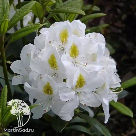 Рододендрон Madame Masson – вечнозеленый, кустарник высотой до 2,5 м, и шириной до 3 м. Крона прямая, густая, округлая. Растет медленно. У рододендрума Мадам Массон листья темно–зеленые, эллиптические, кожистые, блестящие, длиной 10 – 15 см, 2 – 4 см шириной. Цветыкрупные, до 10 см, почти что плоские, белые с большим желтым глазком, собраны в щитковидные соцветия без аромата. Цветение в мае – июне.