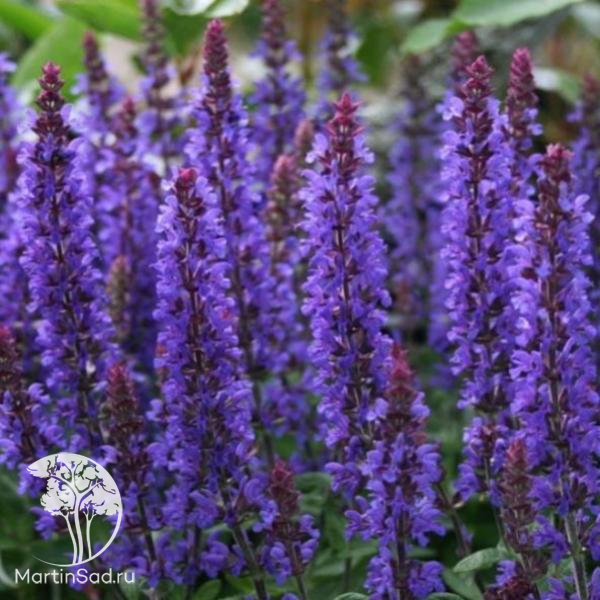 Шалфей дубравный Мерло Блю - компактный и аккуратный кустик вырастает до полуметра в высоту. В июне-августе зацветает обильным цветением лавандово-фиолетового цвета, которое располагается на высоком цветоносе и имеет колосистую форму. Цветки фиолетово-синего цвета, многочисленные, двугубые, собраны в прямостоячий плотный ложный колос. Листья некрупные, серо-зелёные, морщинистые, с волнистыми краями, овально-ланцетовидные. Высаживать необходимо на солнечных места, также допускается полутень. Поливать нужно умеренно и регулярно в жаркую погоду. Предпочитает богатые питательные вещества, проницаемые почвы. Сильный аромат. Используется для оформления клумб и рабаток. Можно выращивать в контейнерах. Имеет лекарственные свойства. Морозостойкость высокая (Зона 4, до -34С).
