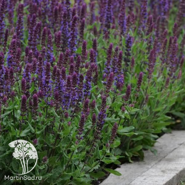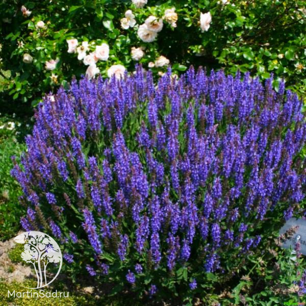 Шалфей (сальвия) дубравный Блаухугель - травянистый кустарник высотой до 70 см, шириной до 50 см. Цветение обильное с июня по июль. Растет быстро, соцветия колосовидные, длинные, синие. Листья ароматные, серовато-зеленые. Считается одним из самых неприхотливых холодостойких представителей рода. Шалфей используется в ландшафтном дизайне при оформлении парковых и прибрежных зон, садовых участков. Хорошо смотрится как в одиночных, так и групповых посадках (сочетается с низкорослыми кустарниками, хвойными деревьями, розаами). Используется в кулинарии и косметологии, при создании медицинских препаратов, эфирных масел. Шалфей дубравный Блаухугель - невысокий сорт с синими цветками. Шалфей дубравный Блаухугель - многолетнее красивоцветущее растение. Растение хорошо переносит временные заморозки, устойчиво к засухе. Место для посадки лучше всего выбирать солнечное. Шалфей любит слабощелочные или нейтральные почвы. Прекрасный медонос. Зона морозостойкости (зимостойкость) 4 (до -34С).