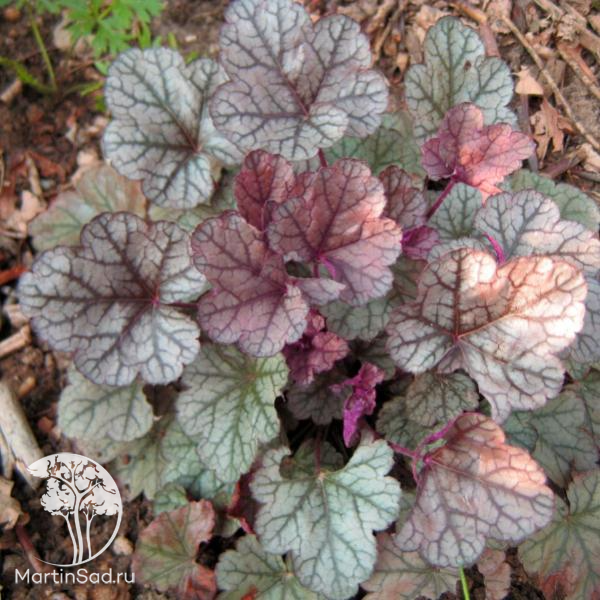 Гейхера Шуга Фростинг – кустик в виде округлого холмика, образует пышную розетку из округлых листьев с металлическим отливом. Высота до 30 см. диаметр около 40 см. Нарастает медленно. У гейхеры Шуга Фростинг листья довольно крупные, округлые, как бы выпуклые матовые с фиолетовыми прожилками. Отличаются нежным серебристо-сливовым оттенком. Цветки кремовые, цветоносы до 25 см. Цветет в июне-июле. Гейхера Шуга Фростинг рекомендуется для посадок в цветниках, ландшафтных композициях, для оформления бордюров и природных садов. Хороша Шуга Фростинг в вазонах и контейнерах. Этот сорт прекрасно сочетается с ирисами, баданом, геранями, примулами и хвойными растениями. Гейхера Шуга Фростинг любит солнечные участки или легкую ажурную тень деревьев. Предпочитает легкие, хорошо удобренные почвы, без застоя воды. Оптимальна нейтральная или слабощелочная почва. В подкормках нет особой необходимости. На зиму листву срезать не надо, она образует естественное укрытие. Молодые растения следует мульчировать на зиму листвой или опилками, и защищать от холодных ветров. С целью омоложения, рассаживать гейхеру можно через 4-5 лет.Морозостойкость хорошая, зона 4 (до -34°С).