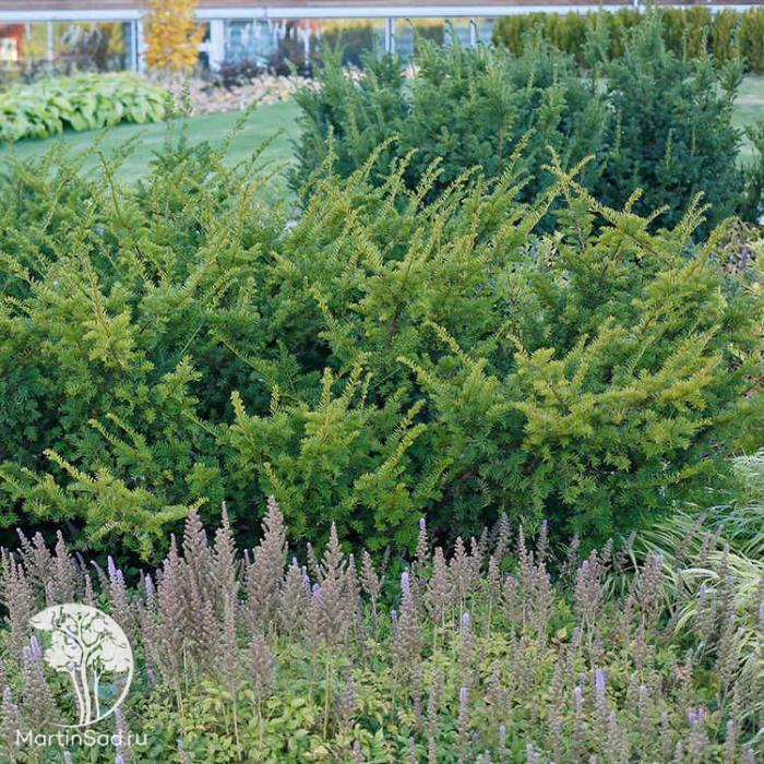 Тис средний «Грин Маунтин» - представляет собой раскидистый густой вечнозеленый кустарник с богатой темно-зеленой хвоей, чей общий облик чем-то напоминает казацкий можжевельник, однако отличается более благородным, изящным и поникающим характером роста. Этот сорт обладает интересной историей: он был обнаружен и выделен американским питомником «Bobbink and Atkins» еще в 1976 году, и с тех пор получил широкое распространение и популярность в садах и парках как в Америке, так и в Европе. Растение демонстрирует сравнительно быстрые темпы роста и за десять лет жизни достигает габаритов примерно 100 см в высоту и 150 см в ширину, тогда как взрослые, зрелые экземпляры способны дорасти до двух метров в высоту и разрастись на впечатляющие четыре метра в ширину. Его крона формируется широкораспростертой, очень плотной и состоит из длинных, густо облиственных ветвей, кора которых имеет красно-коричневый оттенок. Хвоинки длинные, изумрудно-зеленые, с более светлой нижней стороной, что создает красивый визуальный эффект. Важной особенностью является то, что это мужская клональная форма, а значит, она не цветет и не образует ядовитых плодов-ягод, характерных для женских растений тиса.