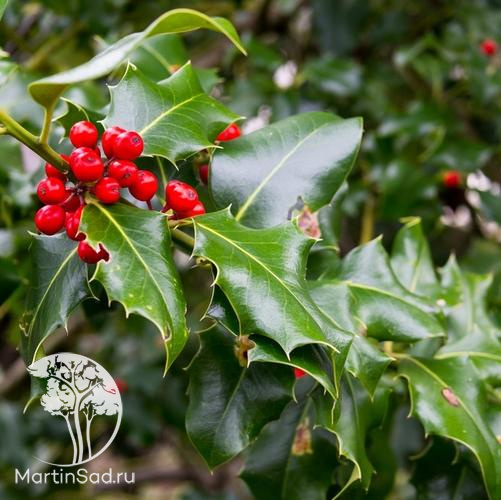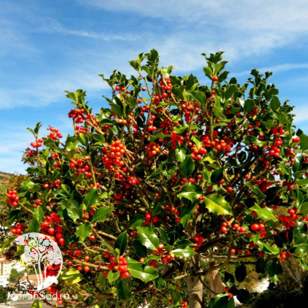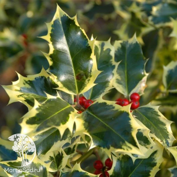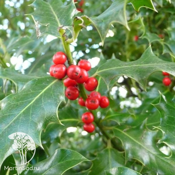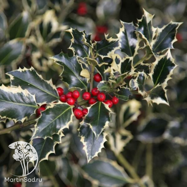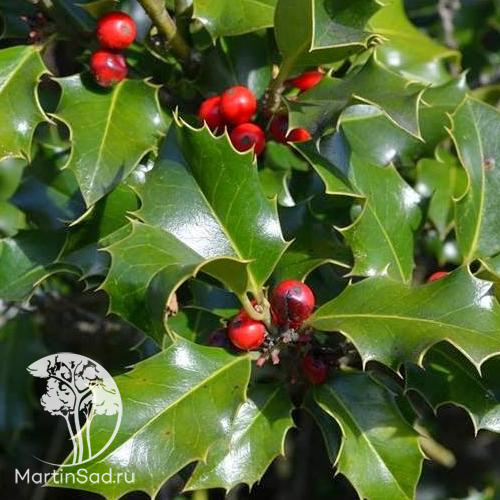 Падуб остролистный - вечнозелёный, среднерослый, эффектный кустарник, отлично подходящий для формирования живых изгородей, высотой 1,5-3 м и шириной 1-2 м. До высоты 1,5 м вырастает за 10 лет. Форма кроны сначала узкопирамидальная, затем округлая. Этот вид очень популярен для городского озеленения благодаря своей высокой устойчивости к загрязнению и способности расти в различных условиях. Листья сильно заострённые, колючие, тёмно-зелёного цвета или с кремово-жёлтой окантовкой. Куст хорошо поддается стрижке. В жаркие солнечные дни они могут выгорать до почти салатового оттенка. Цвететение с мая по июнь, многочисленными, малоприметными жёлтыми соцветиями, несмотря на что данный кустарник считается прекрасным медоносом. Плоды — шаровидные костянки ярко-красного цвета, до 1 см в диаметре, блестящие, несъедобные, до весны будут украшать кустарник. Падуб остролистный - идеальный выбор для тенистого сада, он гармонично смотрится в составе с многолетниками, хвойниками и злаковыми травами. Для посадки подойдёт солнечное или полутенистое место, нейтральный плодородной, дренированной почвой. Морозостойкость этого падуба соответствует зоне 5 (до-29°С), соответственно в регионах с более суровым климатом рекомендуется на зиму укрывать.