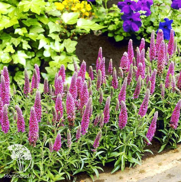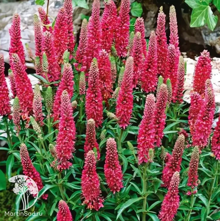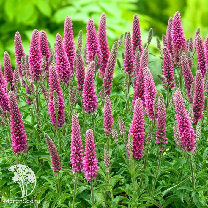 Вероника колосковая «Хайдекинд» — привлекательный многолетний сорт, отличающийся ярким и продолжительным цветением. Растение формирует компактный куст высотой от 40 до 60 см. Его украшением служат плотные колосовидные соцветия длиной до 10 см, окрашенные в насыщенный розово-малиновый цвет. Листья продолговатые, матовые, имеют серовато-зелёный оттенок, что создает красивый контрастный фон для соцветий. Период декоративности начинается с середины июня и продолжается довольно долго — от 35 до 40 дней, захватывая июль и часть августа. Этот выносливый и эффектный сорт станет выразительным акцентом в солнечных цветниках, миксбордерах и хорошо сочетается с растениями светлых и контрастных окрасок.