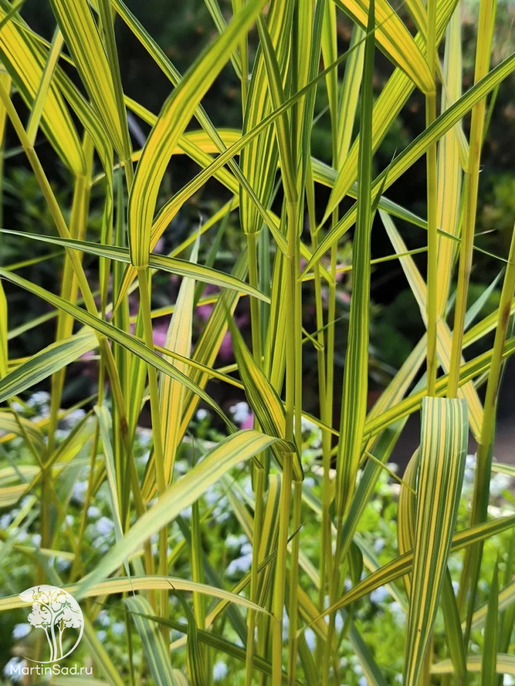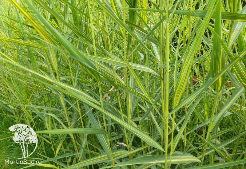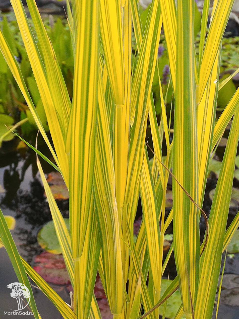 Тростник южный «Вариегатус» (Phragmites australis ‘Variegatus’) - многолетний злак высотой 1,5–2 м с эффектными листьями, украшенными ярко‑жёлтыми продольными полосами, и крупными метёлками (8–40 см), которые в начале цветения буро‑фиолетовые, а к осени светлеют до песочно‑бежевого. Тростник ценится в ландшафтном дизайне для оформления берегов водоёмов, биоочистки и укрепления береговой линии, а также для сухих букетов, однако нуждается в контроле распространения и не подходит для мелких плёночных водоёмов без контейнеров. Растение предпочитает солнечные или полутенистые места, растёт в водоёмах на глубине 0-80 см либо на влажных плодородных почвах у берега, выдерживает морозы до −35 °C.