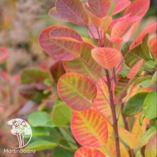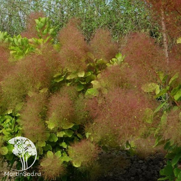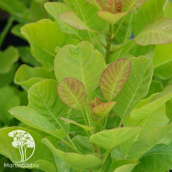Скумпия кожевенная «Лемон Леди» (Cotinus coggygria 'Lemon Lady') — это эффектный листопадный кустарник с раскидистой, широкой кроной, достигающий в высоту 2–3 метров. Главной особенностью сорта является его уникальная, меняющаяся листва: летом она имеет насыщенный золотисто-желтый оттенок, а осенью окрашивается в яркие оранжево-алые тона. В июне-июле на кусте появляются мелкие кремово-желтые цветки, которые после цветения превращаются в пышные, воздушные соцветия-метелки, напоминающие облака «дыма» или «парики», что придает растению особую декоративность. Сорт отличается неприхотливостью, засухоустойчивостью и хорошей морозостойкостью (до -26°C), предпочитает солнечные места и хорошо дренированные почвы.