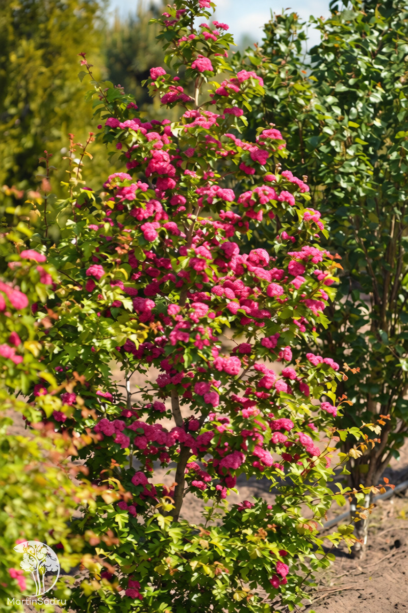 Боярышник средний Рубра Плена на штамбе — это истинный аристократ сада, способный составить конкуренцию легендарным японским сакурам. Его главная особенность и гордость — невероятно пышное цветение, которое превращает дерево в сплошное розовое облако. В конце мая крона покрывается тысячами крошечных густомахровых цветков, напоминающих миниатюрные розочки насыщенного розово-красного цвета с изящным белым центром. Это зрелище длится несколько недель, наполняя сад нежным, едва уловимым сладковатым ароматом и создавая атмосферу романтики и роскоши. Благодаря штамбовой форме, это дерево выглядит как изысканный живой букет на стройной ножке, который идеально впишется в парадную зону или аллею.