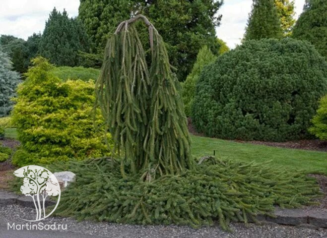 Пониклая, узко‑колоколообразная крона с «змеевидными» побегами, напоминающая кобру; нижняя часть образует эффектную «юбку», лежащую на земле, верхняя - вертикальный столб с ниспадающими ветвями. Сохраняет декоративность круглый год благодаря тёмно‑зелёной хвое.