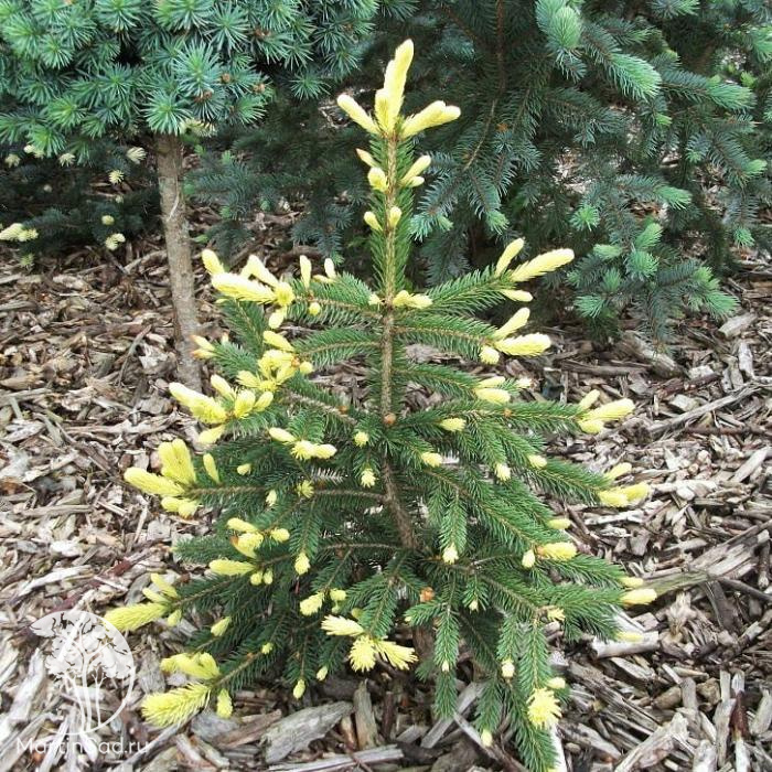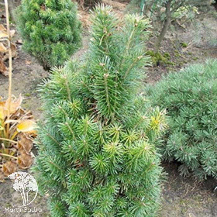 Ель колючая «Корник 2000» (Picea pungens 'Kornik 2000') — эффектный хвойный сорт с плотной регулярной конической кроной, который высоко ценится за уникальный цветовой контраст. Дерево растет умеренно быстро, достигая к десятилетнему возрасту высоты 2–2,5 метров, а его главной особенностью являются весенние молодые приросты нежного кремово-белого цвета, которые ярко выделяются на фоне старой сизо-зеленой хвои. Со временем молодые побеги темнеют, приобретая благородный голубовато-стальной оттенок, сохраняющий декоративность в течение всего года. Сорт отличается жесткой колючей хвоей, мощной ветроустойчивой корневой системой и исключительной выносливостью: он легко переносит суровые морозы до -34°C, летнюю засуху и загазованность городского воздуха, что делает его идеальным акцентным растением для парадных зон и контрастных ландшафтных композиций.