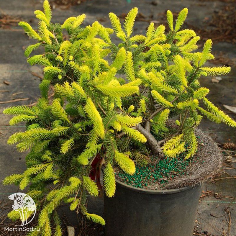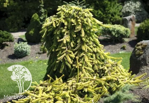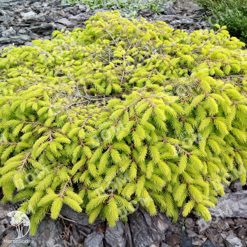 Декоративный карликовый сорт с живописной стелющейся формой кроны и золотисто‑зелёной хвоей, которая сохраняет яркость круглый год; во взрослом состоянии достигает высоты до 0,8 м и разрастается в ширину до 2,3 м, отличаясь крайне медленным ростом (ежегодный прирост минимален). Растение неприхотливо: хорошо переносит полутень, морозостойко (зона USDA 3, до −40 °C), устойчиво к типичным болезням хвойных и не требует сложного ухода после укоренения. Предпочитает дренированные, умеренно влажные, слабокислые почвы, а в первые годы нуждается лишь в регулярном поливе и мульчировании приствольного круга. Благодаря компактным размерам и эффектной окраске хвои ель идеально подходит для малых садов, альпинариев, рокариев и контейнерного выращивания, создавая яркий акцент в ландшафтных композициях. При правильном уходе растение десятилетиями сохраняет декоративность, не теряя формы и насыщенности цвета.