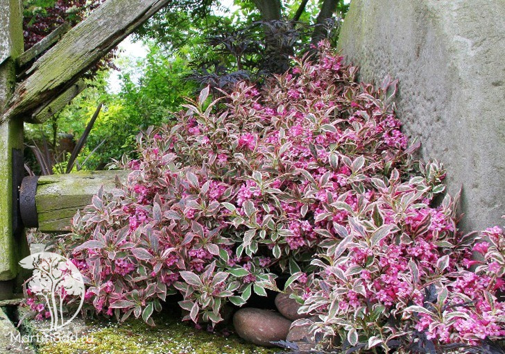 Отличается высокой декоративностью благодаря пёстрой листве (светло‑зелёной с кремовой каймой) и нежным розовым колокольчатым цветкам, а осенью приобретает багрово‑красный оттенок; растение неприхотливо в уходе - легко адаптируется к разным условиям, не требует частых подкормок и сложной обрезки, подходит даже начинающим садоводам; обладает хорошей морозостойкостью (зона USDA 5, до −29 °C) и устойчивостью к болезням и вредителям, что снижает необходимость в химической обработке; цветёт дважды за сезон (май–июнь и август–сентябрь), обеспечивая длительное декоративное оформление сада; компактный размер (1,2–1,5 м в высоту и ширину) позволяет использовать кустарник в небольших садах, живых изгородях и смешанных композициях без риска заглушить соседние растения.