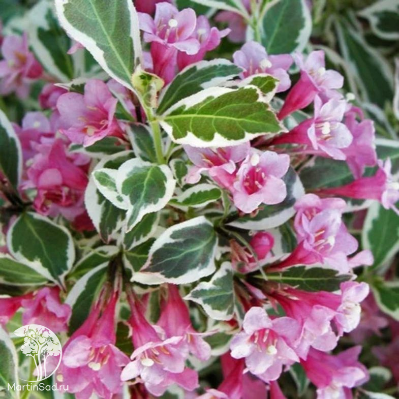 Декоративный листопадный кустарник с необычной пёстрой листвой и обильным цветением; листья широкоэллиптические, светло‑зелёные с кремово‑белой каймой, осенью приобретают багрово‑красный оттенок, а нежные розовые колокольчатые цветки собраны в кистевидные соцветия и украшают куст дважды за сезон - в мае–июне и августе–сентябре; растение достигает 1,2–1,5 м в высоту и ширину, формирует компактную, плотную крону с прямыми побегами; отличается хорошей морозостойкостью (зона USDA 5, до −29 °C), устойчивостью к болезням и неприхотливостью в уходе; идеально подходит для небольших садов, живых изгородей и смешанных композиций, добавляя яркие акценты в ландшафтный дизайн.